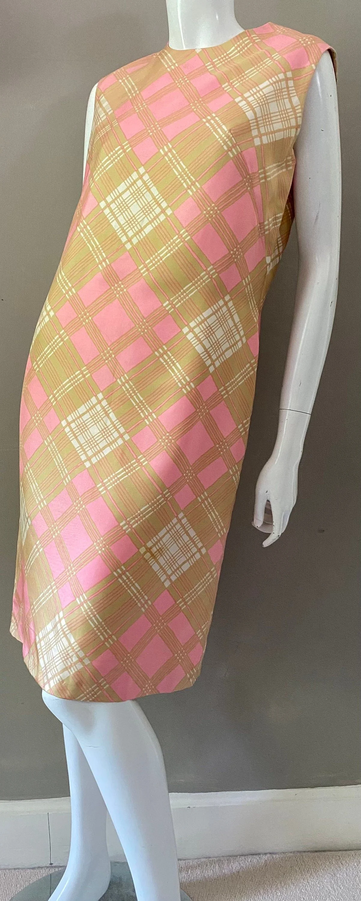 1960s J. Tiktiner Silk Mini Dress: Pink Gold Check Print, Riviera Chic (UK 10)