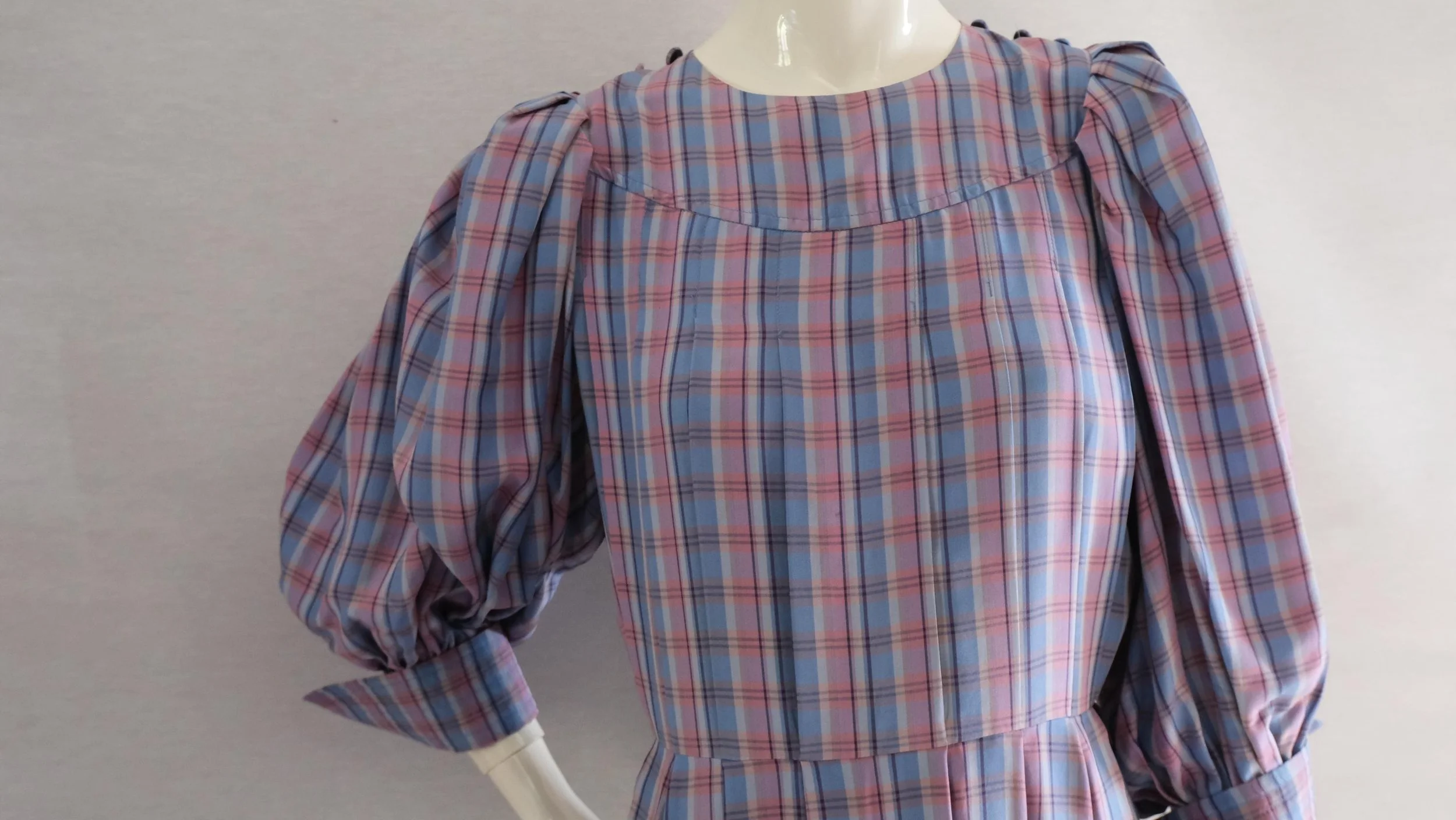 Droopy and Browns Silk Vintage Checked Pleated Silk Day dress with enormous sleeves size 14 pink and blue silk