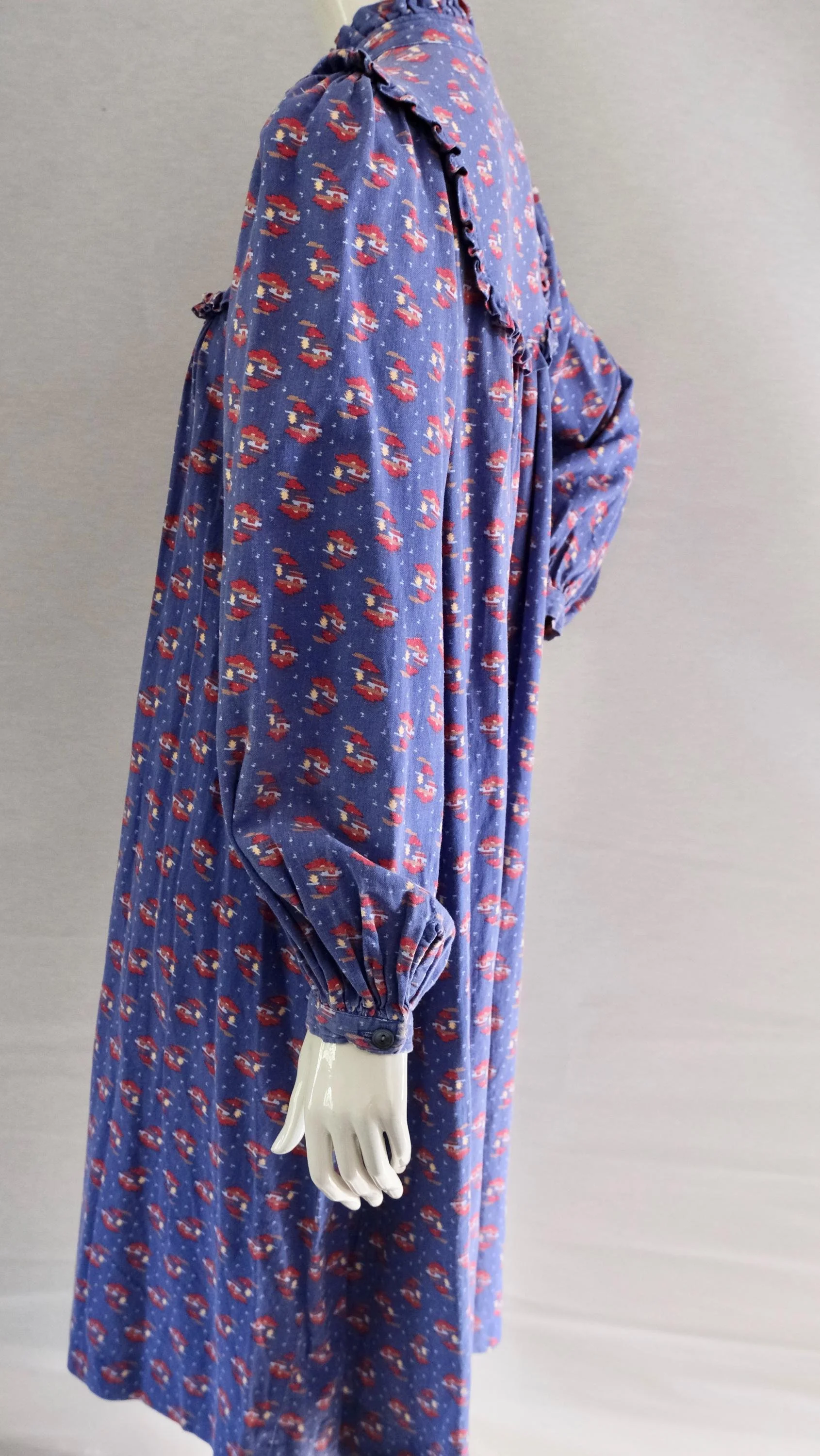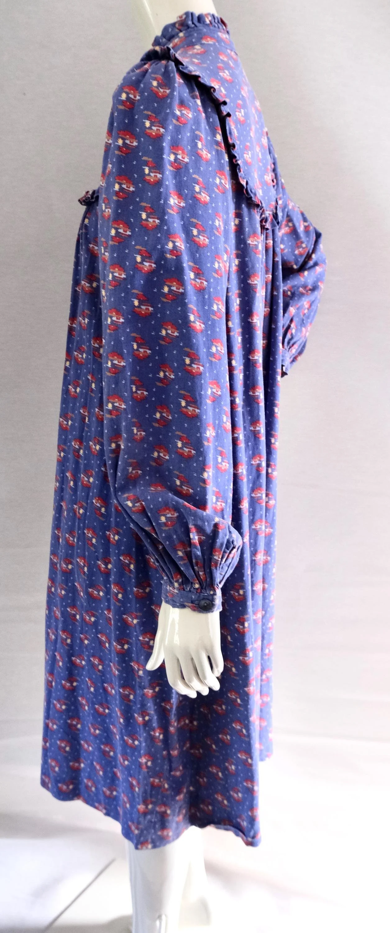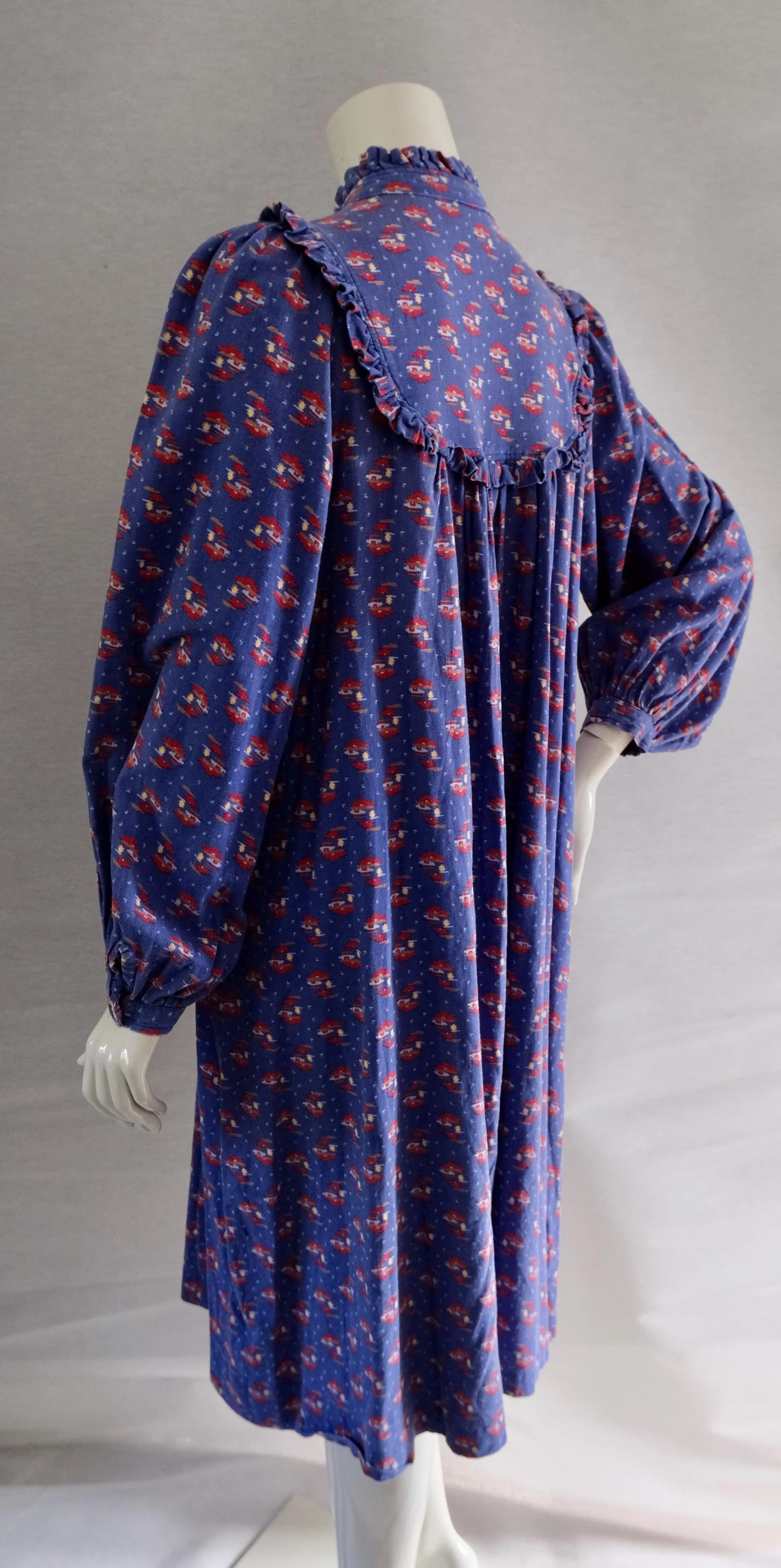 Laura Ashley Made in Carno Wales Early Label Smock Dress: Abstract Blue Print, Ruffle Trim (UK 10)