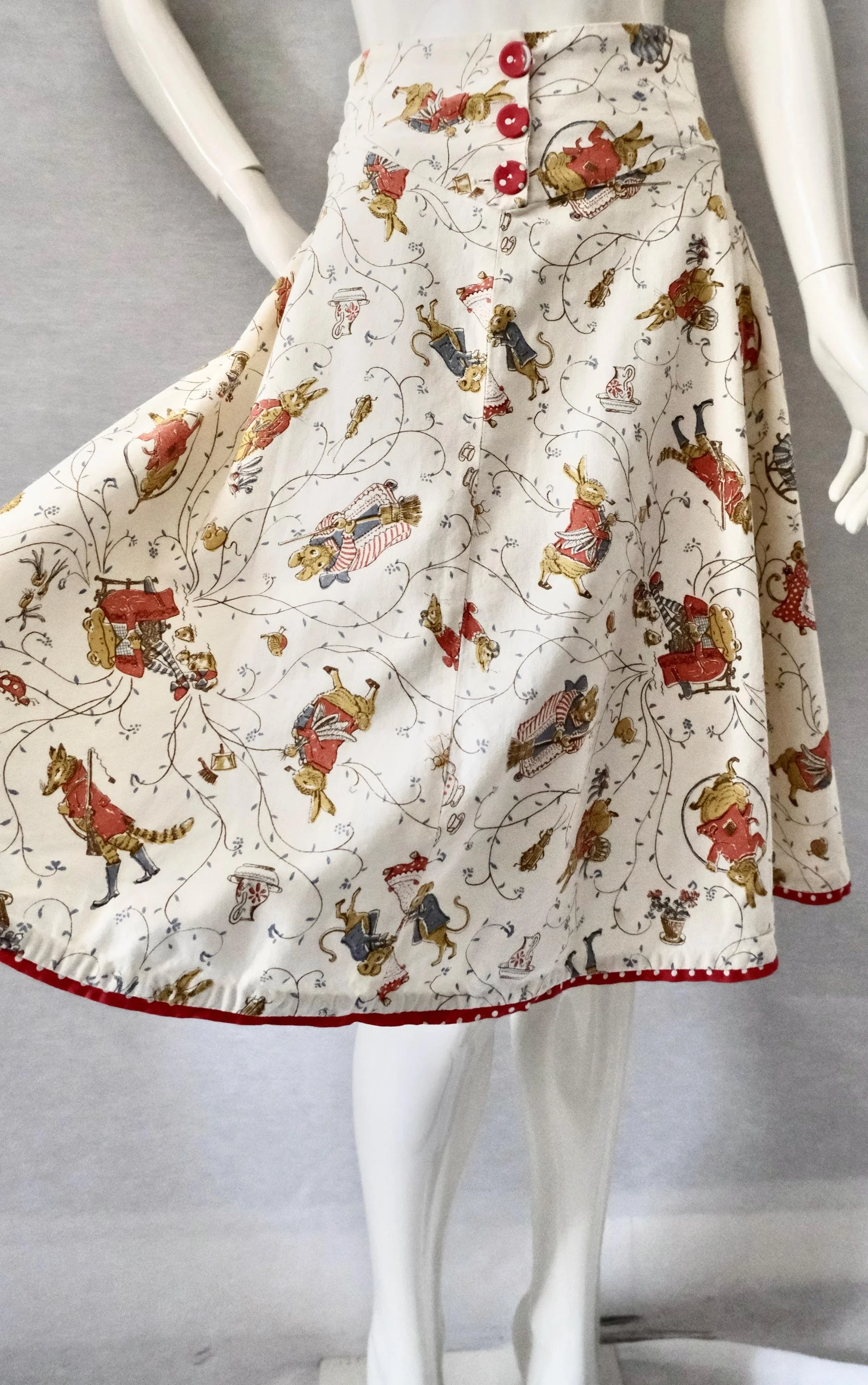 Miss Mouse From Rae with love and Kisses Rae Spencer Cullen Designer of the 1970s Kitch revival label Miss Mouse. Charming Nursery Rhyme Characters, birds etc. There are very few pieces in existance of this print which has Raes early label. very cute circle skirt in a heavy cotton. deep inverted V waist band with 3 red buttons with white polka dots opening. the polka dot fabric trims the hem also.