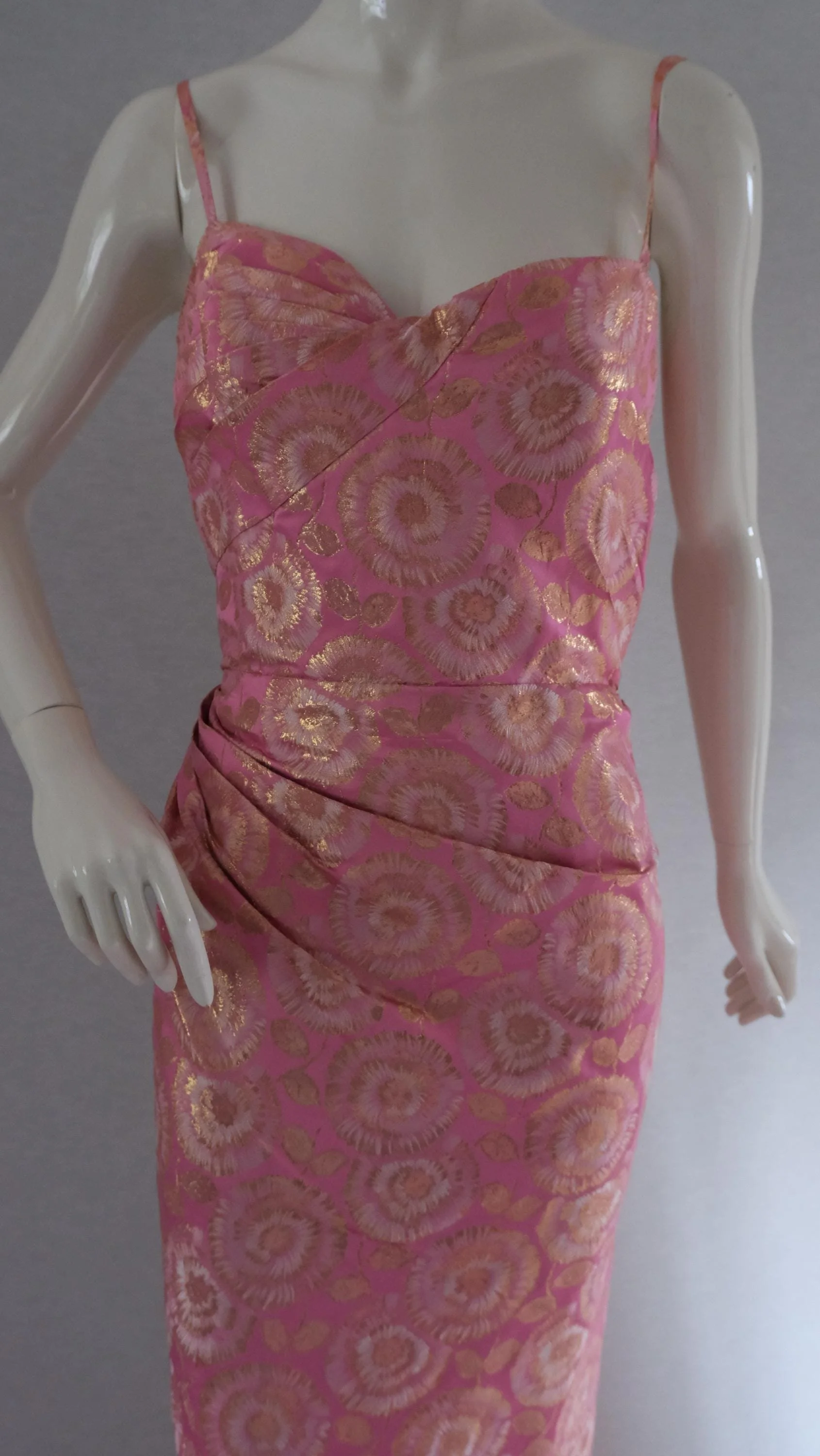 Beautiful draped goddess gown. Paper fine pink silk with gold flower print. Boned bodice insert Full zipper at the back Wonderful mermaid figure hugging cut . Fully lined This is a glorious dress incredibly glamourous the silk shimmers rustles as you walk!!
