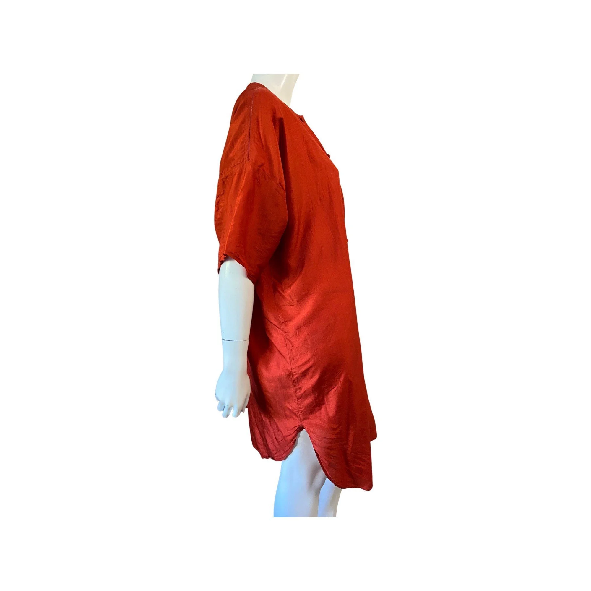 Fine copper terracotta coloured silk dress with very subtle fine stitched details. Round neck with cut and stitched chevron trim. covered buttons through the front. One central inverted pleat at the back. shirt style hem. one breast pocket.