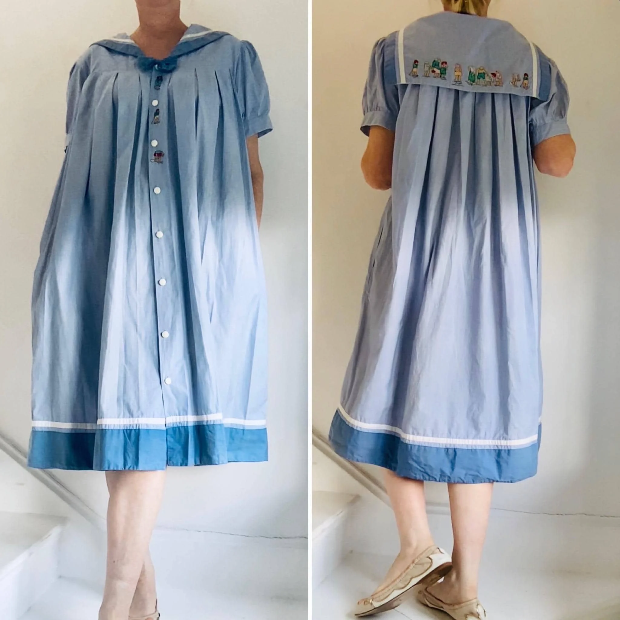 Rene Dehry Paris Vintage 1980s Beautiful Cotton Poplin smock dress Cotton is a lovely weight is a fine blue and white stripe Button through dress with box pleating front and back puffed sleeves with small should pads pockets Beautiful embroidery depicting some type of fishing activity possibly shellfishing Very pretty.