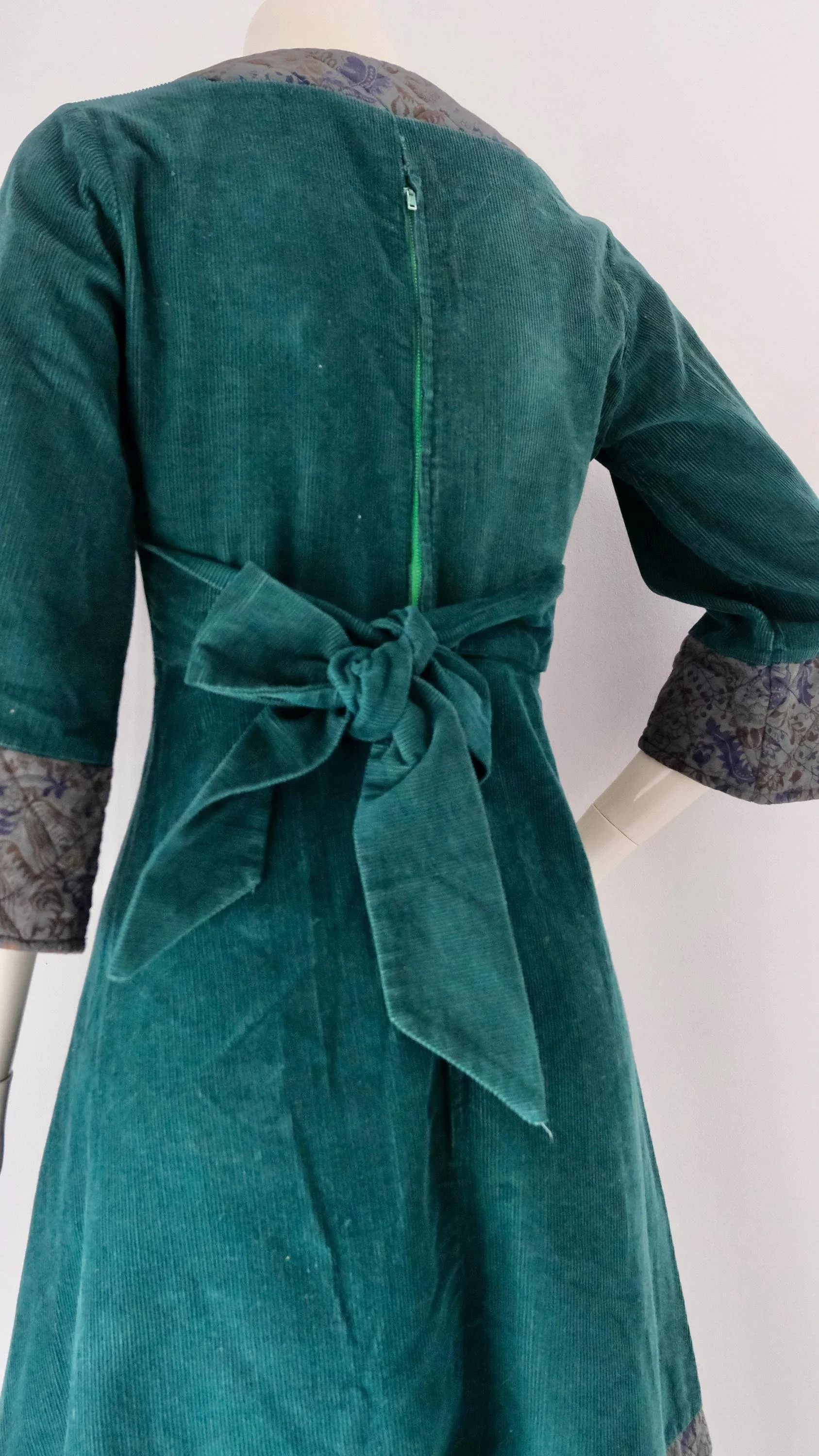The Dove Clothing Company Very Rare Cotton Corduroy Dress. Fitted bodice with button and loop closure Quilted neckline with muted floral and foliage block print. 3/4 length bell sleeves with quilted trim High waistline with thick belt ties at the back A-line mid calf length skirt. Zips up through the middle of the back .