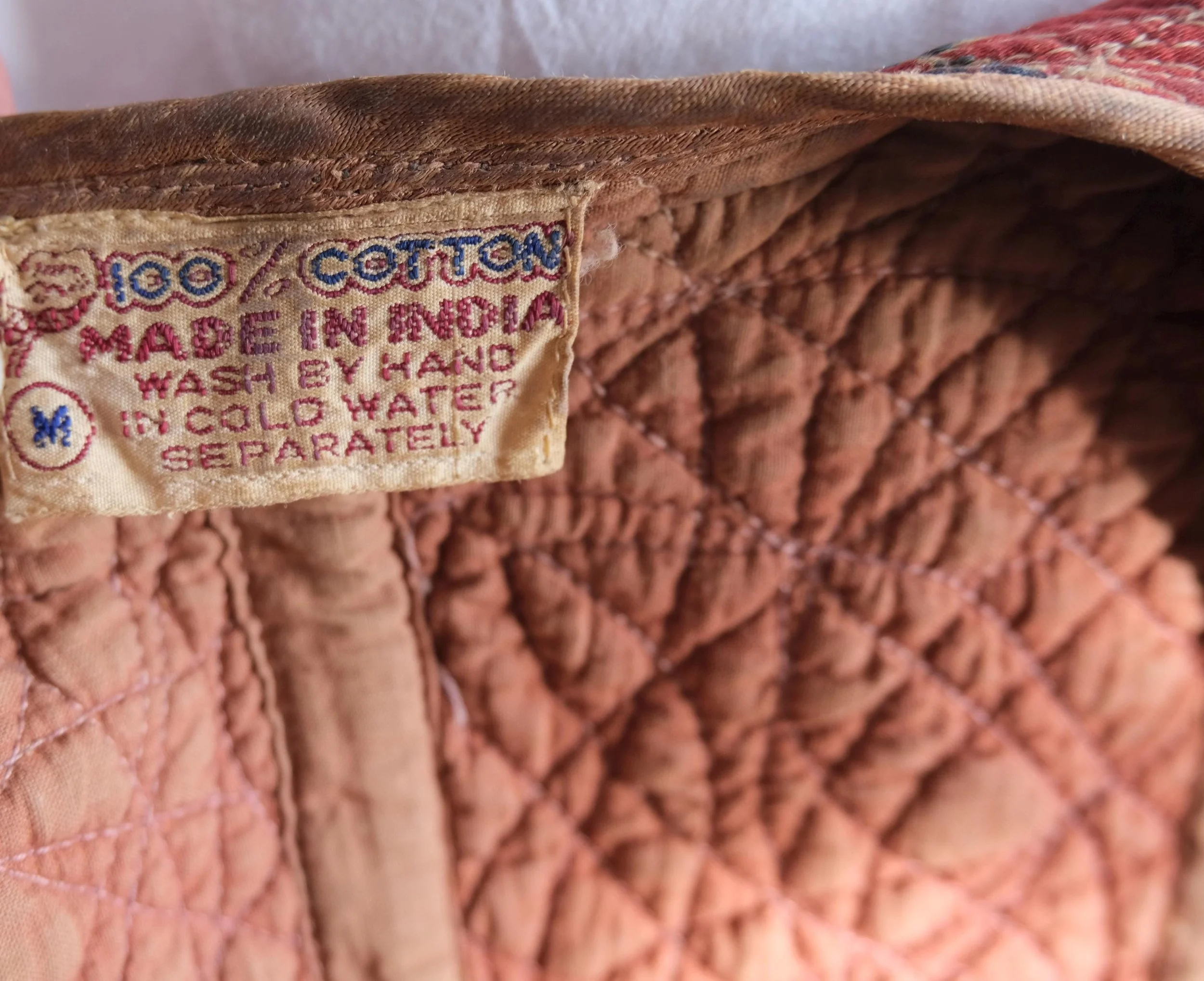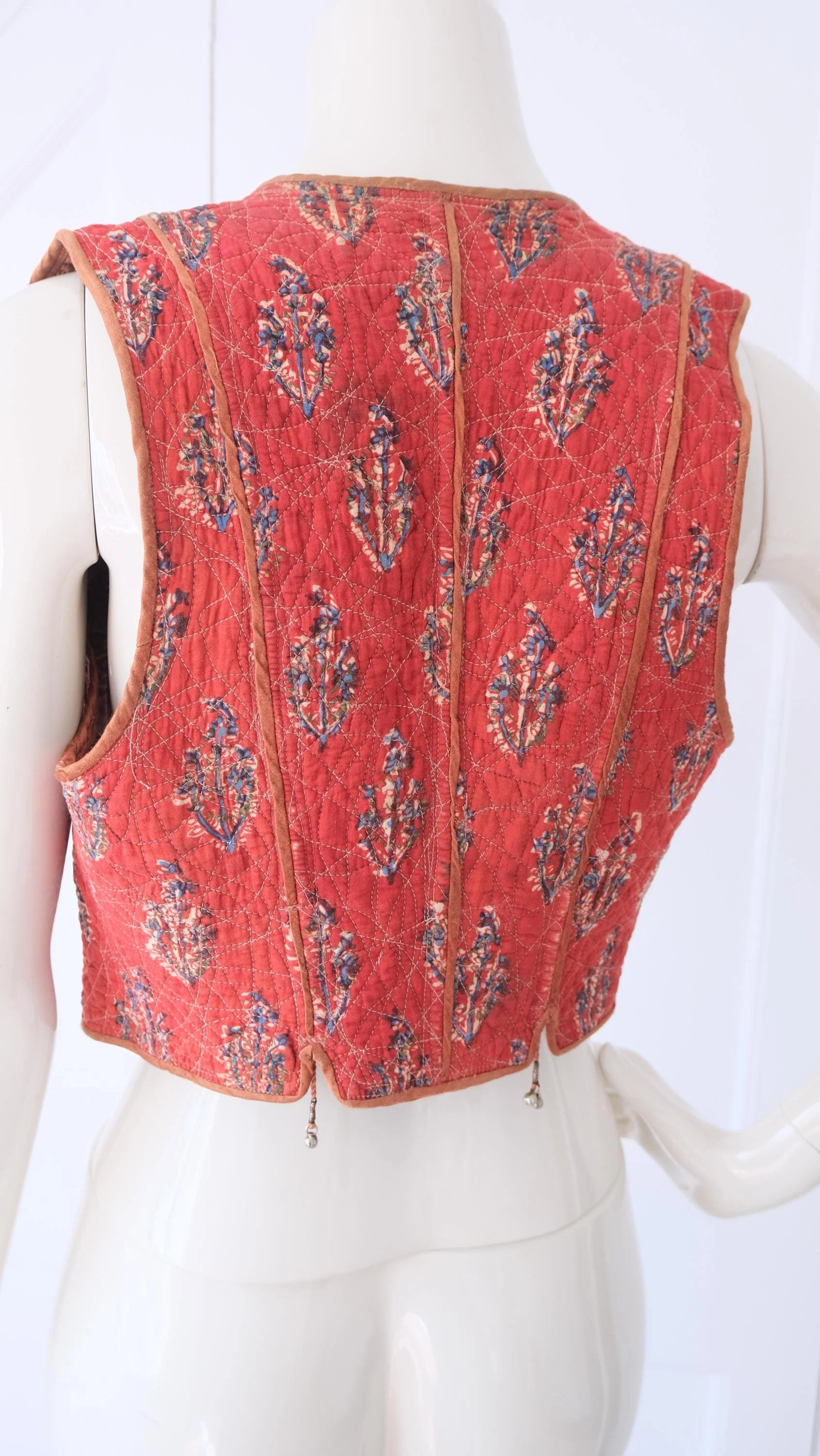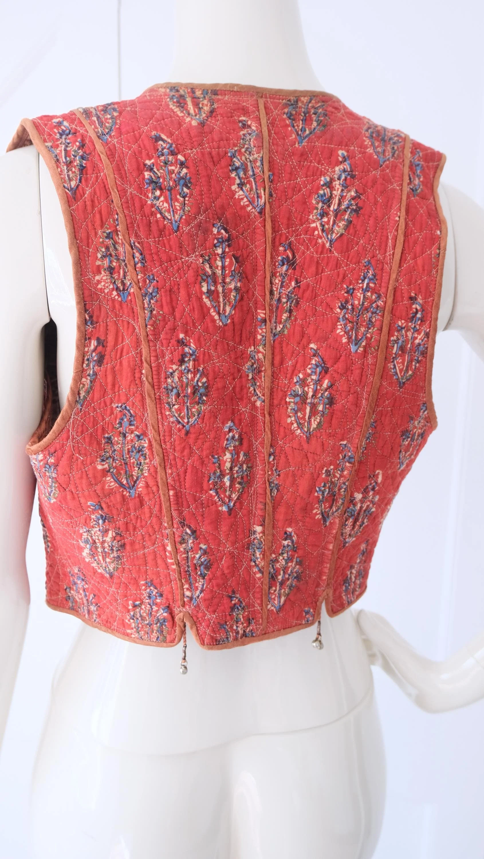 Vintage 1960s Indian Block Printed Cotton Quilted Over stitched Waistcoat with bells Red Blue M Phool Adini India Imports Hippie Trail