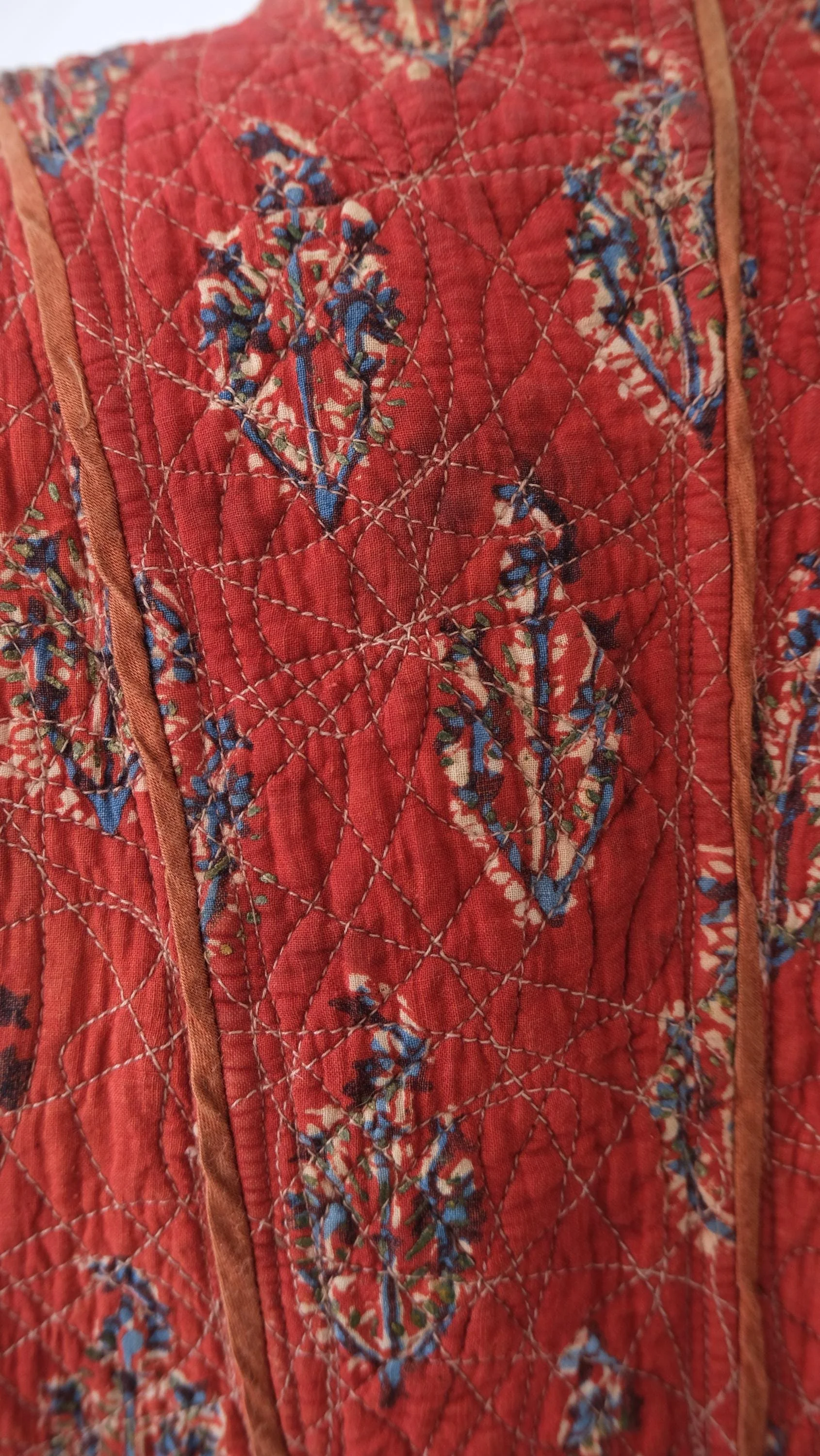 Indian Block printed Waistcoat late 1960s Very beautiful rust and blue toned colour way Over stitched and block printed cut away shape panelled with silk piped trim size M label Measurements across shoulders-13in pit-pit-17in nape-hem-16in Excellent condition - beautifully faded